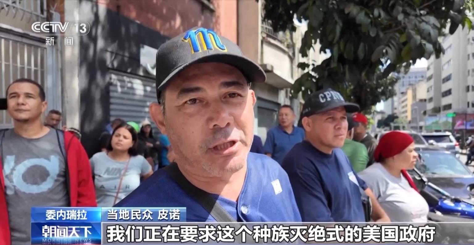 当地民众 皮诺:我们正在要求这个种族灭绝式的美国政府,要么把我们的总统交还给我们,要么提供他仍然活着的证据。我们的总统是在一次卑劣、可耻的行动中,被这个帝国主义政府绑架并带走的。他们并不关心自由,也不关心民主,他们关心的只有我们的石油,只有我们的自然资源。